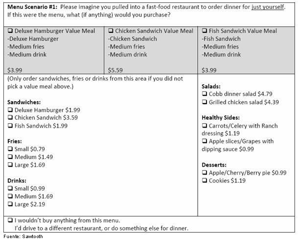 En cambio, en el MBC, el entrevistado puede ver el menú completo que se le ofrece y lo que ello conlleva: Precio, posibilidad de añadir o no algún componente más, variaciones de precios, cantidad, calidad y aspecto de los ítems…